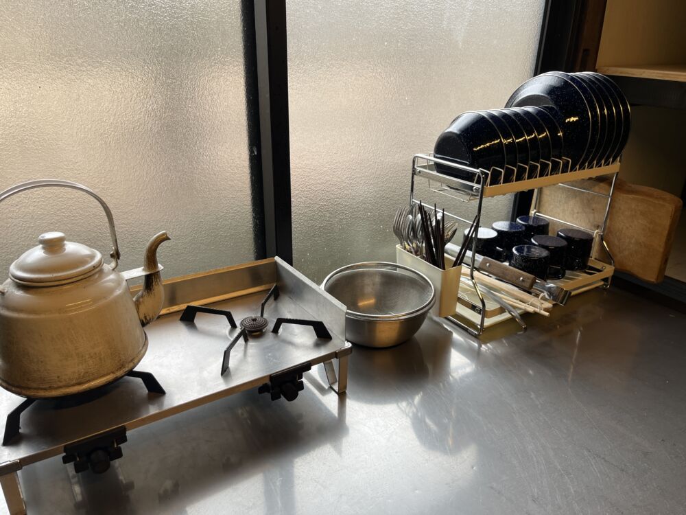 簡易キッチン:キッチンテーブル、ツーバーナー、ナイフ、カッティングボード、ヘラ、お玉、ザル、ボウル、食器・カトラリー類